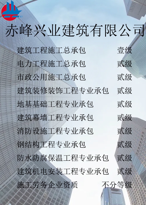 赤峰興業(yè)建筑有限公司簡介 赤峰興業(yè)建筑有限公司成立于1998年7月,位于內(nèi)蒙古赤峰市松山區(qū)。現(xiàn)已發(fā)展成為擁有建筑工程施工總承包壹級、電力工程施工總承包貳級、市政公用工程施工總承包貳級、承裝、修、試四級、?建筑裝修裝飾工程專業(yè)承包貳級、建筑幕墻工程專業(yè)承包貳級、消防設(shè)施工程專業(yè)承包貳級、地基基礎(chǔ)工程專業(yè)承包貳級、鋼結(jié)構(gòu)工程專業(yè)承包貳級、建筑機(jī)電工程專業(yè)承包二級、防水防腐保溫工程專業(yè)承包貳級以及建筑施工勞務(wù)等資質(zhì)的綜合性建筑施工企...